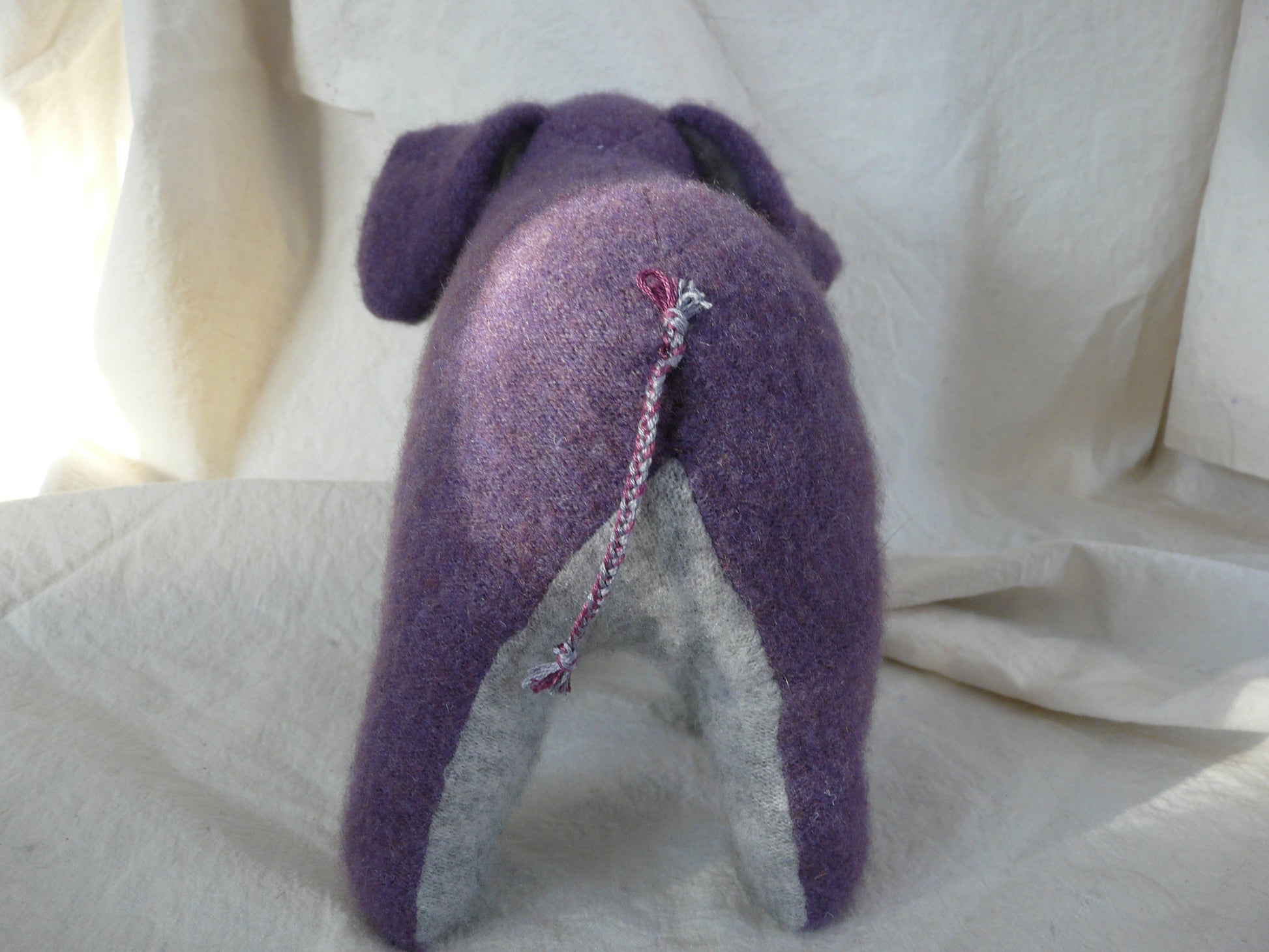 10" tall cashmere stuffed Elephant. Two color, purple with grey tummy and braided tail. Eyes are knots (not beads) for safety. Soft and cuddly!